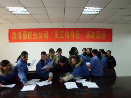為更好的傾聽(tīng)員工心聲,切實(shí)幫助員工解決工作上存在的困惑、生活上遇到的問(wèn)題,本著(zhù)“關(guān)心工作、關(guān)心生活、關(guān)心成長(cháng)”的杰博服務(wù)文化,“為客戶(hù)服務(wù)的心,永無(wú)止境;為員工服務(wù)的心,永無(wú)止境”的服務(wù)宗旨, 致力于成為中國人力資源服務(wù)行業(yè)“員工服務(wù)效率”和“員工滿(mǎn)意度”最高的人力資源服務(wù)機構的服務(wù)目標,2011年12月23日我司聯(lián)合客戶(hù)單位舉辦了杰博重慶分公司“員工接待日”活動(dòng)。