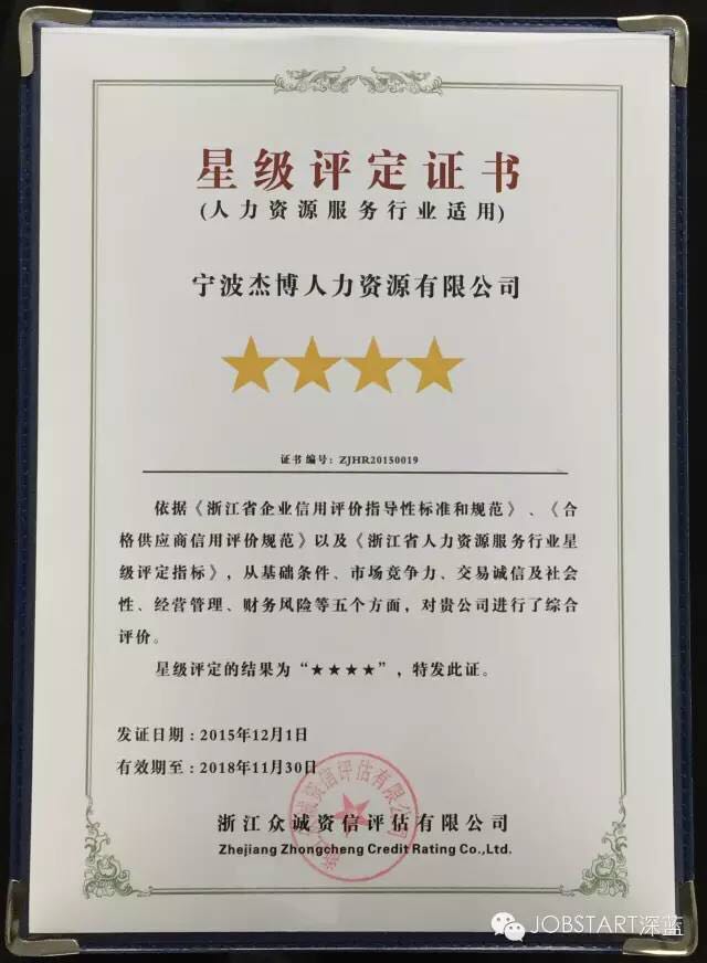 2016年1月6日,在杭州召開(kāi)的浙江省人力資源服務(wù)協(xié)會(huì )第一屆第三次會(huì )員大會(huì )典禮上,包括寧波杰博人力資源有限公司在內的17家人力資源企業(yè)獲評首批“浙江省人力資源服務(wù)星級企業(yè)”殊榮,其中,杰博人力資源獲評“四星級”企業(yè)。